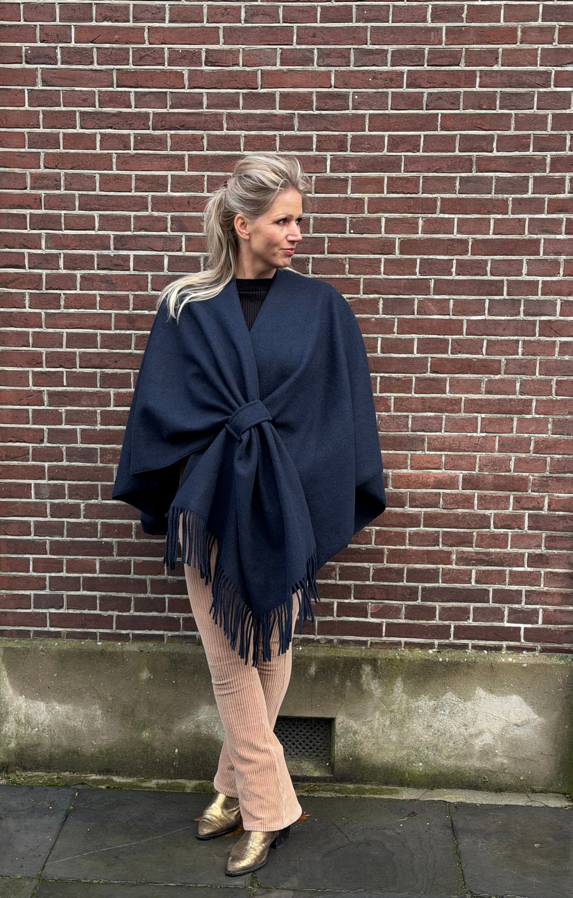 De donkerblauwe omslagdoek ook wel poncho genoemd, ademt rust en klasse, ideaal voor wie houdt van ingetogen elegantie.